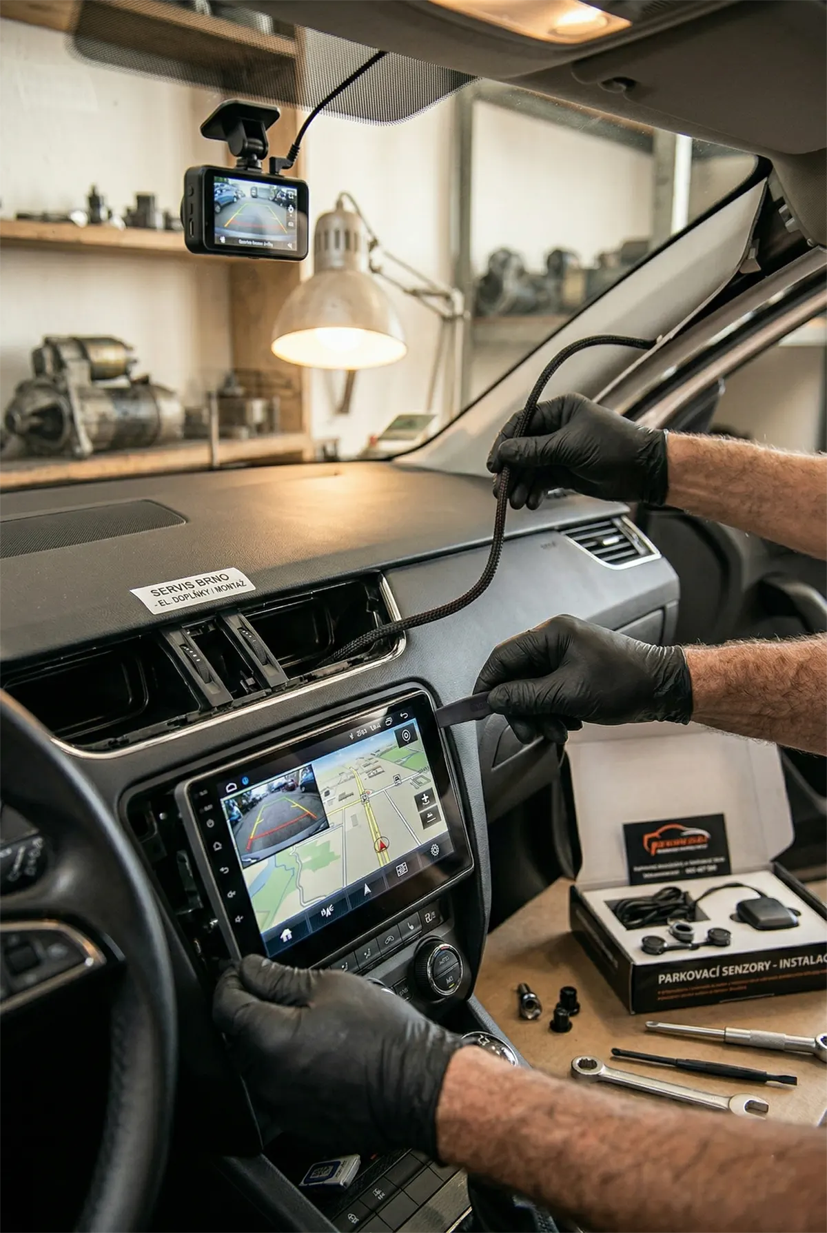 - Parkovací a couvací senzory a kamery: Instalace asistentů pro bezpečné parkování, zadních i předních senzorů a integrace couvacích kamer s displejem na palubní desce.